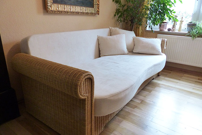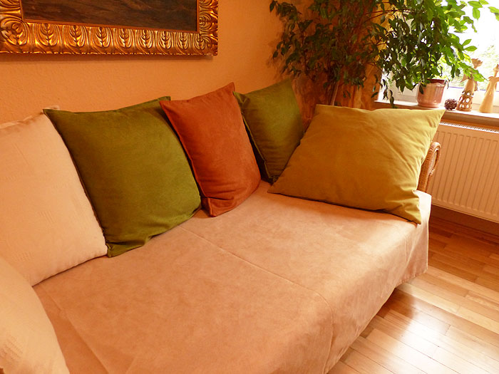 Weiße Polster sind schön, aber auch empfindlich. Bezüge in warmen Farben kann man ganz schnell abziehen und waschen.