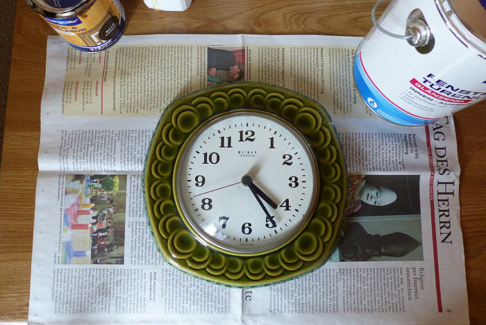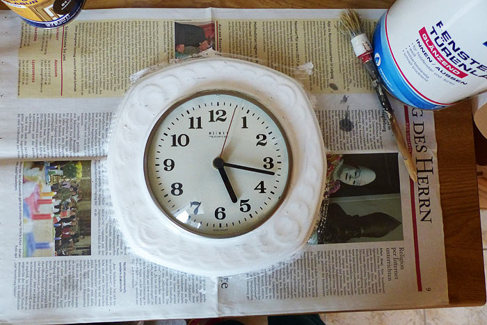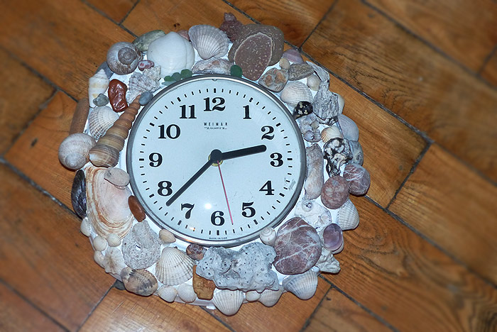 Die Uhr gefiel einfach nicht mehr, ist aber solide gearbeitet und wurde mit einem Funk-Uhrwerk nachgerüstet. Mit weißer Acrylfarbe grundiert, wurde sie nun mit Strandgut beklebt und kann mit hübschem Antlitz noch einige Jahre ihren Dienst tun.